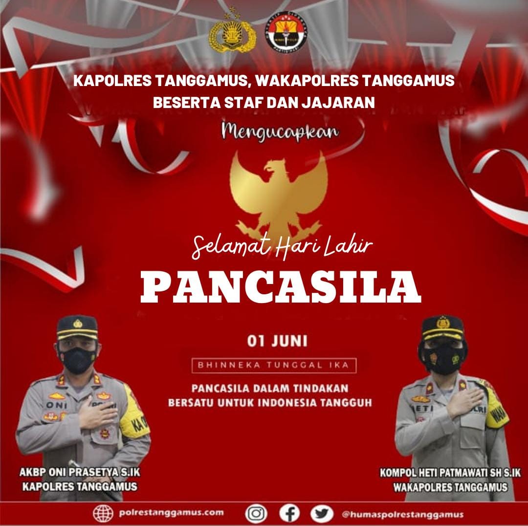 “Kami, Kapolres Tanggamus beserta seluruh staf dan jajaran mengucapkan selemat memperingati hari lahir Pancasila tanggal 1 Juni 2021, mari kita jaga kebhinekaan, kerukunan, saling menghargai dan menghormati, menjunjung tinggi asas persatuan dan kesatuan,” ucapnya.