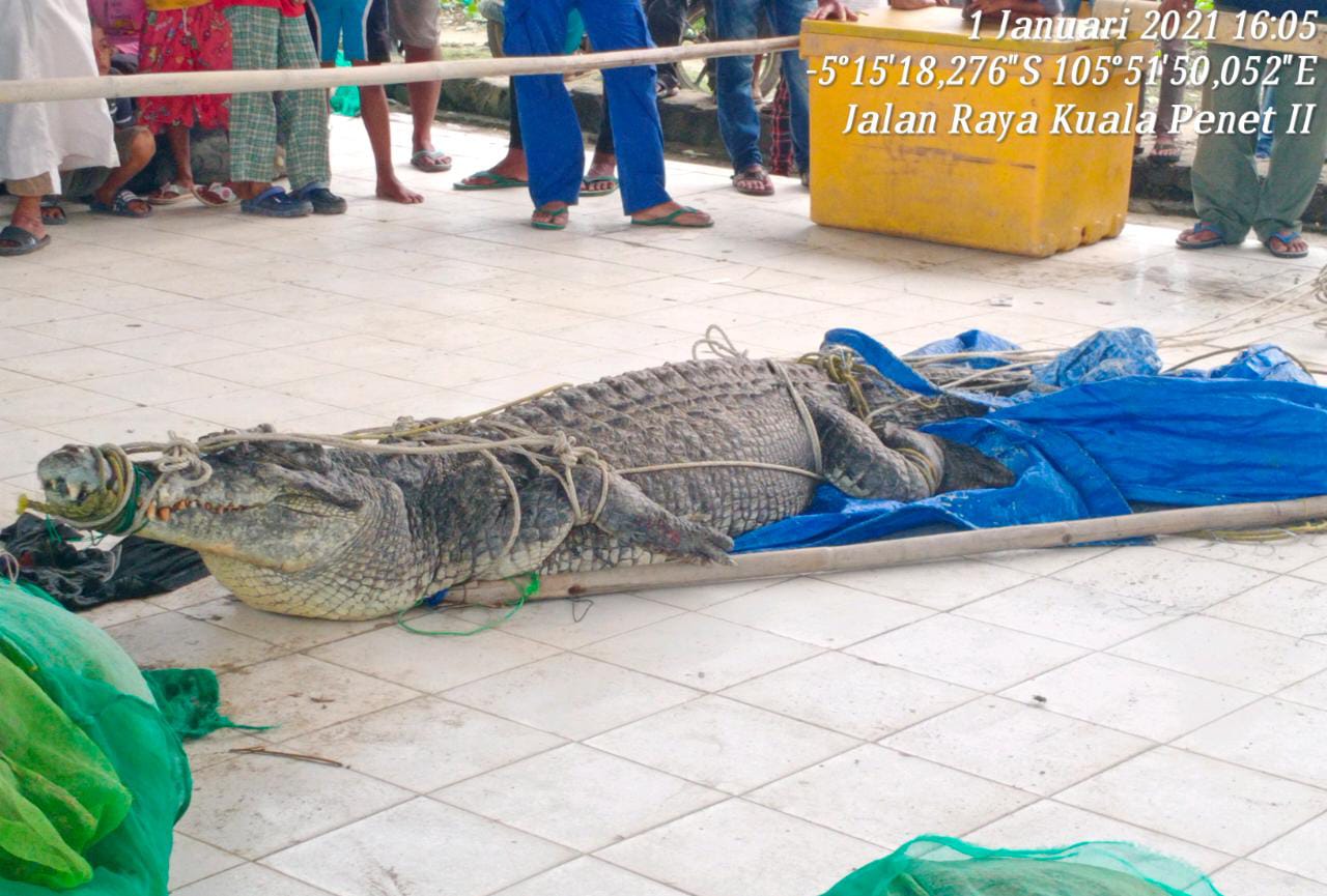 Saibumi.com – Seekor buaya tangkapan nelayan dari Tempat Pelelangan Ikan Kuala Penet di Desa Margasari, Kecamatan Labuhan Maringgai, Lampung Timur dievakuasi petugas Balai Konservasi Sumber Daya Alam (BKSDA) Lampung, Jumat, 1 Januari 2021, malam.