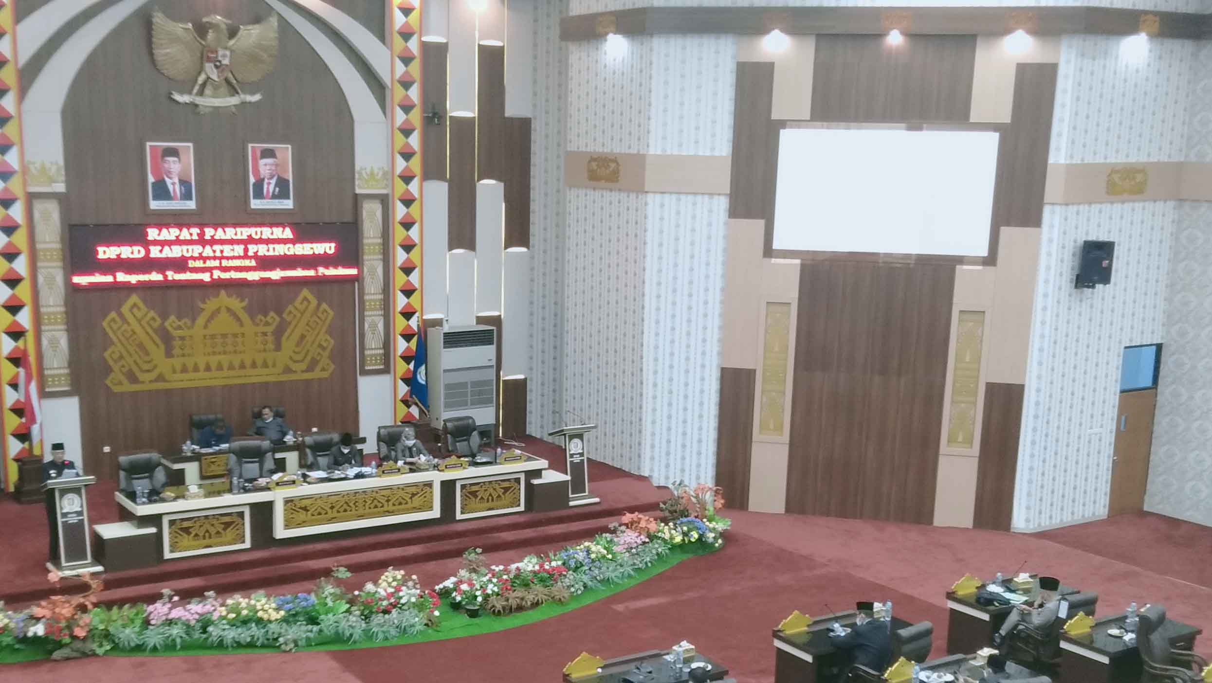 Rapat paripurna yang dipimpin Ketua DPRD Pringsewu Suherman, SE didampingi para Wakil Ketua DPRD ini, juga dihadiri Sekretaris Daerah Kabupaten Pringsewu Drs.H.Heri Iswahyudi, M.Ag. beserta jajaran Pemkab dan Forkopimda Pringsewu.