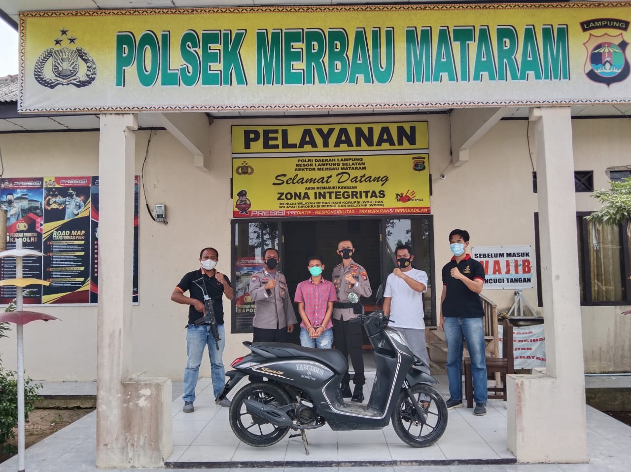 Saat ini pelaku BAH (19) bersama barang buktinya berupa 1 (satu) unit sepeda motor Honda GNIO warna hitam Nopol BE 5429 DK sudah diamankan di Poksek Merbau Mataram.