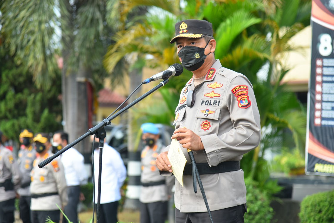 Bandarlampung, etalaseinfo (SMSI) – Kapolda Lampung Irjen Pol Hendro Sugiatno memimpin apel upacara Pemberhentian Tidak Dengan Hormat (PTDH) terhadap personel yang bermasalah, di Mapolresta Bandarlampung pada Senin (1/11/2021) pagi.