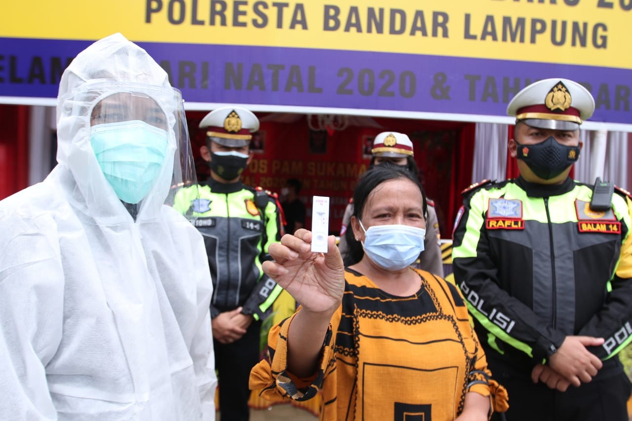 BANDAR LAMPUNG: Jajaran Satuan Lalu Lintas (Satlantas) Polresta Bandar Lampung melakukan rapid tes antigen massal, bagi para wisatawan luar daerah yang hendak berwisata ke sejumlah tempat wisata di Pesawaran dan Bandar Lampung, Minggu (3/1/2021). Pelaksanaan rapid tes antigen ini dilaksanakan di Pos Pengamanan Jalan RE Martadinata, Sukamaju, Telukbetung Timur, Bandar Lampung.
