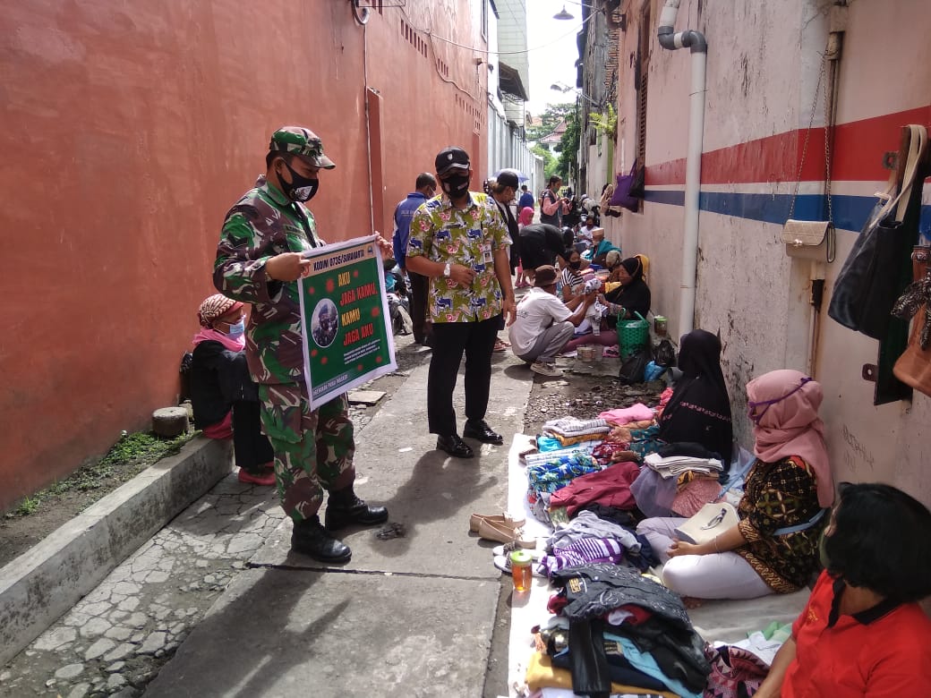 Dalam rangka memutus mata rantai penyebaran covid 19, khususnya di wilayah Kota Surakarta, Babinsa Koramil 05/Pasar Kliwon Kodim 0735 Surakarta Serda Agus Santoso bersama Lurah dan Linmas Gajahan melaksanakan pengecekan dan himbauan protokol kesehatan penanganan Covid-19 di lingkungan pasar Rombeng di Rt 03/1V Kelurahan Gajahan Kecamatan Pasar Kliwon Kota Surakarta, Rabu (03/02 2021). Seperti dilaporkan lampungvisual.com jaringan, siberindo.co.