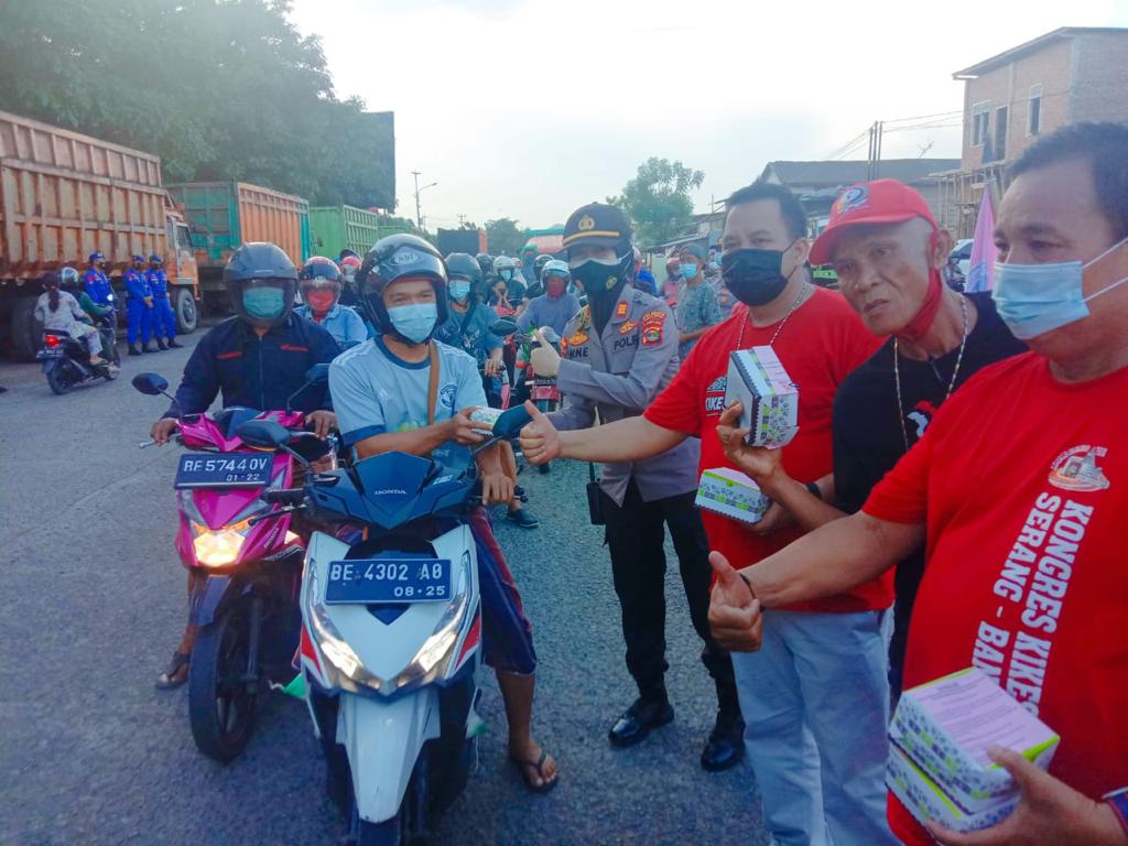 Peringati Hari Buruh, Polri dan Serikat Buruh Kikes Bagikan Takjil Gratis
