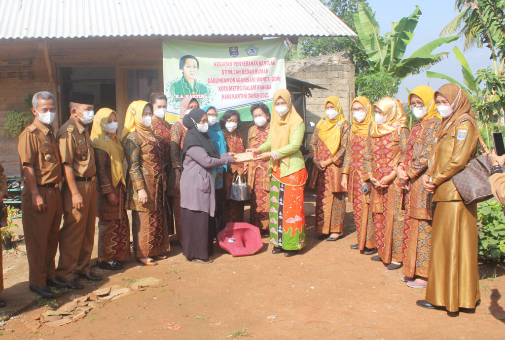 Metro, etalaseinfo.com (SMSI) – Dalam Rangka Hari Kartini 2021, Ketua TP PKK Kota Metro bersama dengan Ketua GOW Kota Metro beserta anggota, Kepala Dinas PPPAPP&KB Kota Metro, berikan bantuan secara simbolis kepada warga penerima bantuan stimulasi bedah rumah di 5 Kecamatan Kota Metro, Senin (03/05/2021).