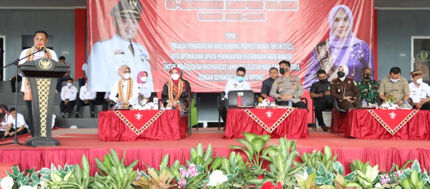 Hal itu disampaikan Bupati Lampung Selatan H. Nanang Ermanto saat menyampaikan sambutan sekaligus membuka acara Hari Kunjung Perpustakaan dan Bulan Gemar Membaca serta Pengukuhan 17 Bunda Literasi Tingkat Kecamatan se-Kabupaten Lampung Selatan yang dipusatkan di Lapangan Tenis Indoor, Kalianda, Rabu pagi (3/11/2021).
