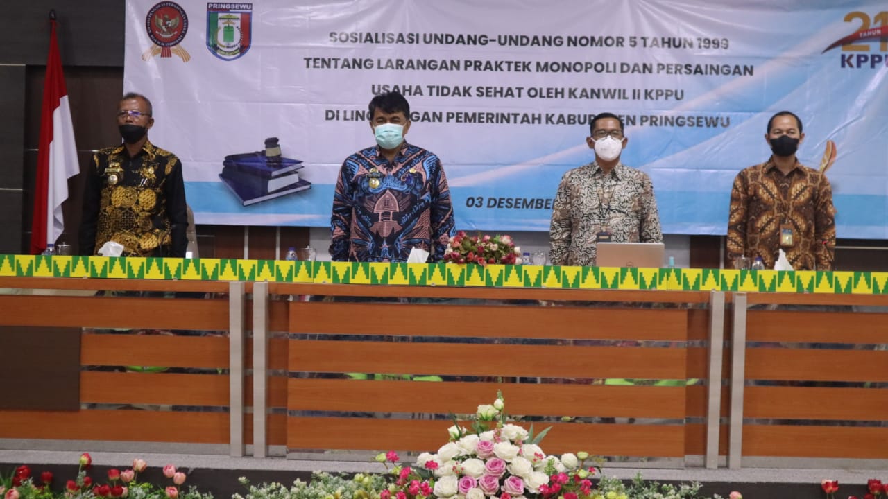 Sekretaris Kabupaten Pringsewu Heri Iswahyudi saat membuka kegiatan ini di Aula Utama Pemkab Pringsewu, Jumat (3/12/21) sangat mendukung diadakannya sosialisasi UU No.5 tahun 1999 yang menurutnya sangat penting, sebagai upaya untuk mencegah terjadinya praktek monopoli yang dapat merugikan masyarakat, di samping persaingan usaha yang tidak sehat. “Oleh karena itu, saya meminta seluruh peserta mengikuti dengan sungguh-sungguh, sehingga nantinya mengetahui ketentuan-ketentuan yang diatur dalam undang-undang tersebut”, pintanya.