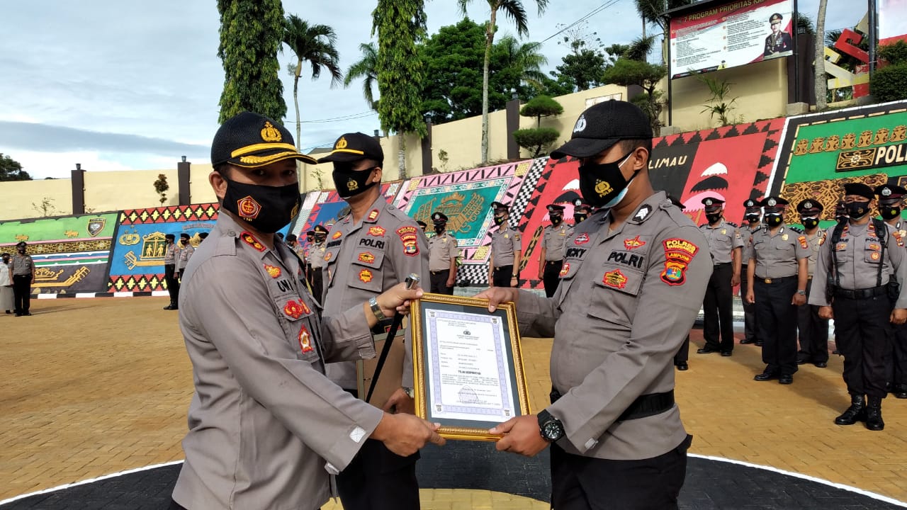 Penyerahan piagam seluruh penghargaan oleh Kapolres Tanggamus AKBP Oni Prasetya, SIK usai korp raport kenaikan pangkat personelnya di Lapangan Apel Mapolres, Senin (4/1/21).