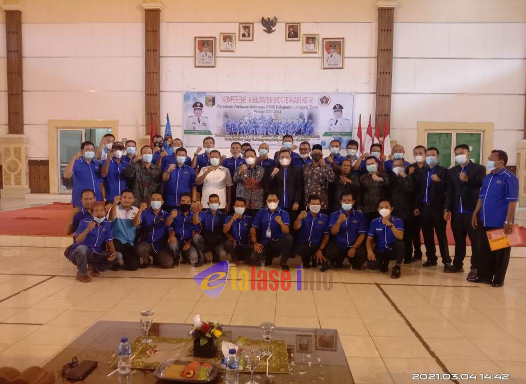 METRO,etalase info.com (SMSI) – Musannif Effendi Yusnida kembali terpilih menjadi ketua PWI Lampung Timur (Lamtim) secara aklamasi dalam konferensi kabupaten VI, di Gedung Pusiban Pemkab Lamtim, Sukadana, Kamis (4-3-2021)
