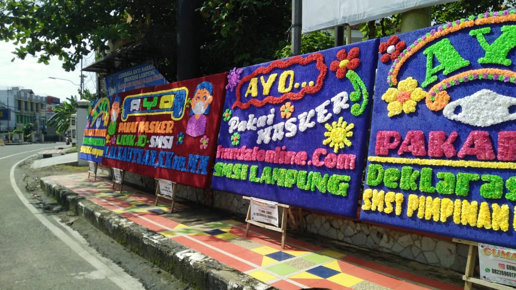 Sesuai data yang masuk ke pengurus SMSI Lampung, ada 50 papan bunga yang siap menghiasai jalan lingkar di bundaran Tugu Adipura. Isi kalimat dalam papan bunga tersebut kompak, Ayo Pakai Masker.