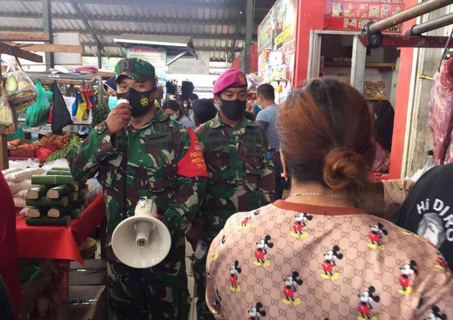 “Hal tersebut terlihat, saat Tim Satgas Covid-19 sedang memberikan himbauan kepada para pengunjung/pedagang untuk tidak berkerumunan saat beraktivitas di dalam pasar Way halim”