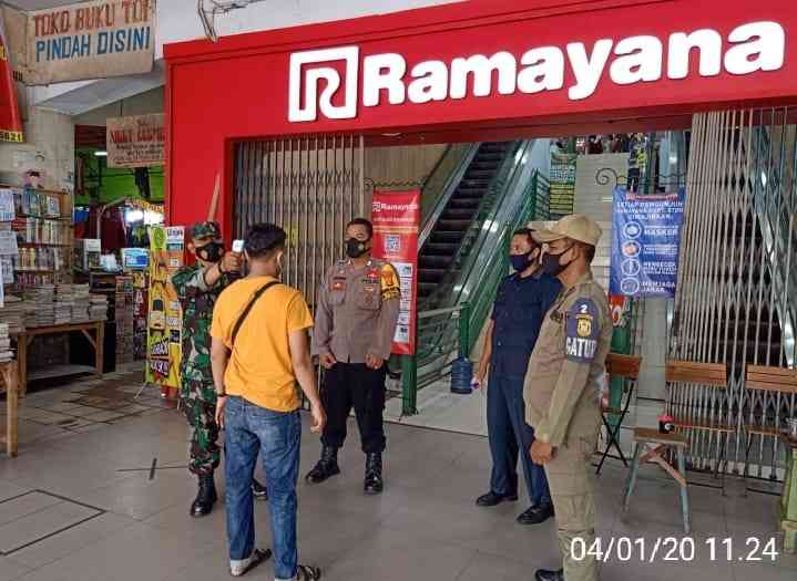 Babinsa Koramil 410-05/TKP bersama dengan Satuan Tugas Penanganan Covid-19 terapkan Protokol Kesehatan kepada para pengunjung Ramayana Bandar Lampung, Jln. Radin Intan Kota Bandar Lampung. Senin (04/1/2021).