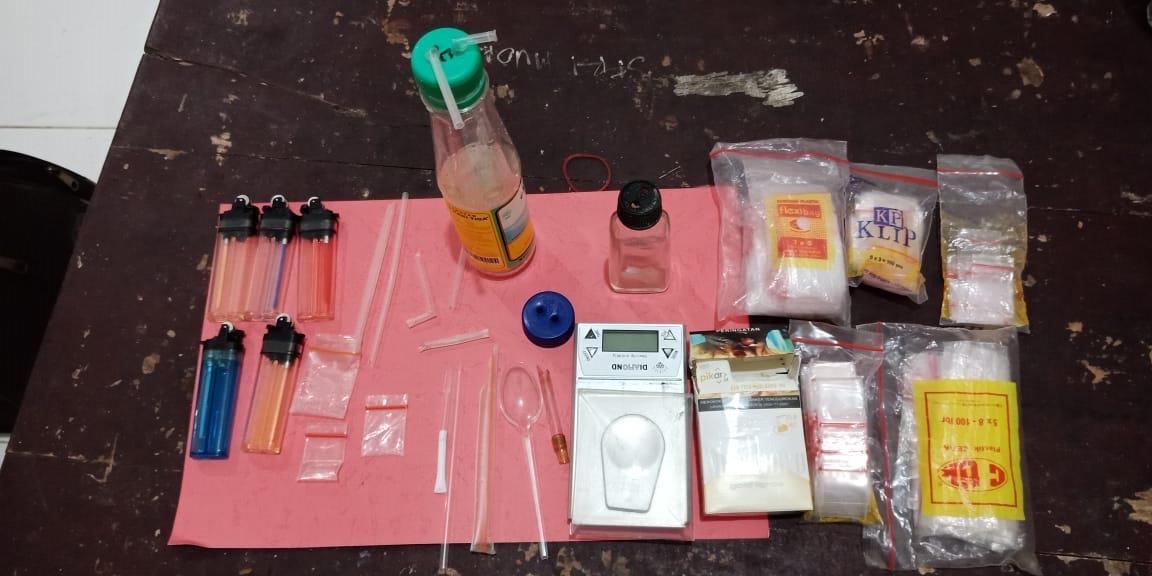 Selain tersangka, petugas juga mengamankan barang bukti berupa satu buah tas warna hitam merk Catalong, satu buah bong/botol kecil minuman larutan cap kaki tiga, satu buah pipa/pirek bekas pakai, 3 (tiga) buah plastik bening sisa pakai yg di duga berisikan kristal shabu, dua buah botol kecil yang tutupnya sudah dimodifikasi terdapat dua buah lubang, satu buah korek api warna merah, tiga buah pipet sedotan, satu buah timbangan digital warna silver merk Diamond, empat pak plastik klip bening yang belum terpakai/baru, satu scop sedotan besar, satu buah sendok plastik, tiga buah pipet sedotan, satu buah tutup botol warna biru terdapat dua buah lubang dan satu buah korek api/gas warna biru.