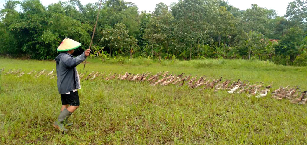 “Alhamdulillah, untuk dua bulan terakhir ini karena sawah banyak yang panen saya angon (menggembala, red.) sendiri bebek-bebek saya di persawahan sekitar sini, yang artinya ada pakan gratis selama jeda waktu antara masa panen hingga masa tanam”, ungkapnya.