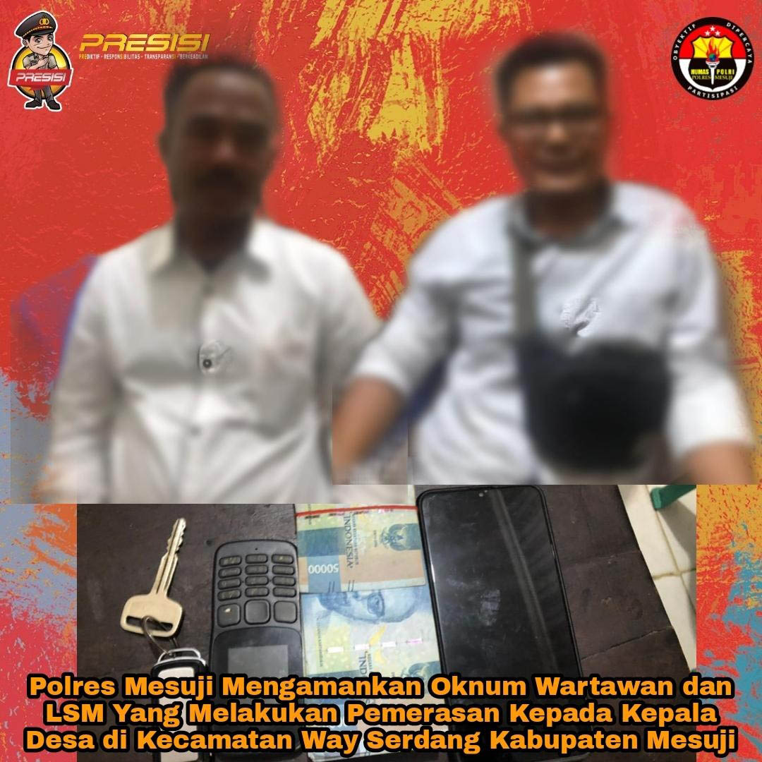 Kapolres Mesuji AKBP Yuli Haryudo S.E yang di Wakili Kasat Reskrim Iptu Fajrian Rizki S.T.K, S.Ik, M.Si, membenarkan terkait penangkapan kepada kedua pelaku yang diduga telah melakukan Tindak Pidana Pemerasan kepada beberapa Kepala Desa yang ada di Kecamatan Way Serdang. Kedua pelaku di amankan bersama Barang Bukti 1 (satu) Unit Mobil Avanza Warna hitam dengan Nopol B 1834 TR, Uang Tunai sebesar Rp. 6.000.000 (Enam Juta Rupiah), 2 (Dua) buah handphone, 1(satu) buah android dan 1 (satu) buah handphone Cumplung (non android).