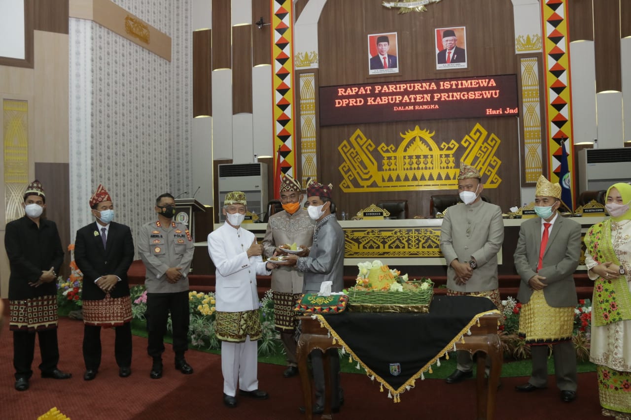 Tampak pula hadir Sekretaris Daerah Heri Iswahyudi dan jajaran pemerintah daerah beserta forkopimda, Ketua TP-PKK Pringsewu Ny.Nurrohmah Sujadi, Ketua DWP Ny.Sri Prihatin Iswahyudi, Ketua Ikada Ny.Suherman, juga tokoh masyarakat, adat, agama, tokoh pejuang pemekaran dan berbagai elemen masyarakat lainnya. Pada kesempatan tersebut, juga dibacakan sejarah singkat berdirinya Kabupaten Pringsewu oleh Wakil Ketua I DPRD setempat Hj.Mastuah dan prosesi pemotongan tumpeng oleh Ketua DPRD Pringsewu, yang diserahkan kepada Staf Ahli Gubernur Lampung, Bupati dan Wakil Bupati Pringsewu.