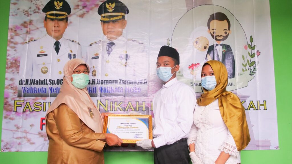 Metro, etalaseinfo.com (SMSI) – Pemerintah kota metro melalui staf ahli 1 walikota metro Juni kuswati menghadiri kegiatan Fasilitasi Pernikahan di Balai Nikah program 100 hari penanggulangan dampak covid 19, di balai nikah KUA Metro Utara, Senin (05/04/2021) kemarin.