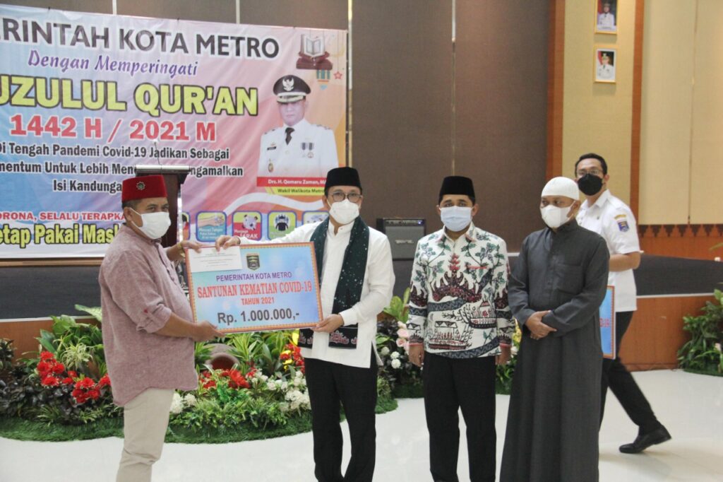 Kegiatan tersebut dilanjutkan dengan pemberian santunan kematian secara simbolis kepada keluarga korban terkonfirmasi Covid-19 sebagai bagian dari salah satu program 100 hari kerja Walikita dan Wakil Walikota Metro.