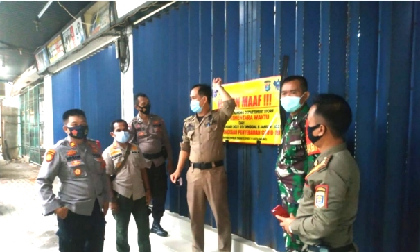 Proses Pemasangan Banner, sebagai tanda penutupan salah satu pusat perbelanjaan terbesar di Kota Metro ini, dilaksanakan oleh Tim Gabungan Gugus Tugas Covid-19 Kota Metro, yang melibatkan Personil Kepolisian, TNI, Satuan Pol PP, dan Tim terkait lainnya. (Eko Arif)