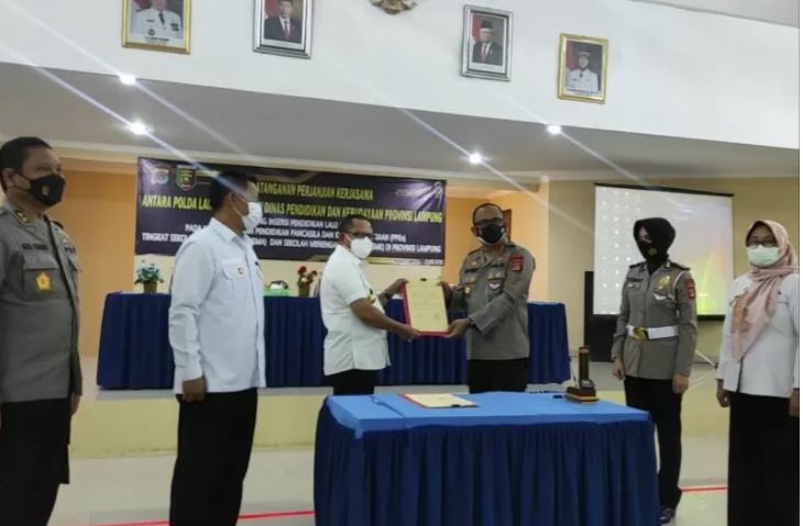 Bandarlampung- Direktorat Lalu Lintas Kepolisian Daerah Lampung bersama dengan Dinas Pendidikan dan Kebudayaan Provinsi Lampung melakukan Penandatanganan Perjanjian Kerjasama tentang Insersi Pendidikan Lalu Lintas pada mata pelajaran Pendidikan Pancasila dan Kewarganegaraan (PPKn) tingkat Sekolah Menengah Atas (SMA) dan Sekolah Menengah Kejuruan (SMK) Provinsi Lampung.