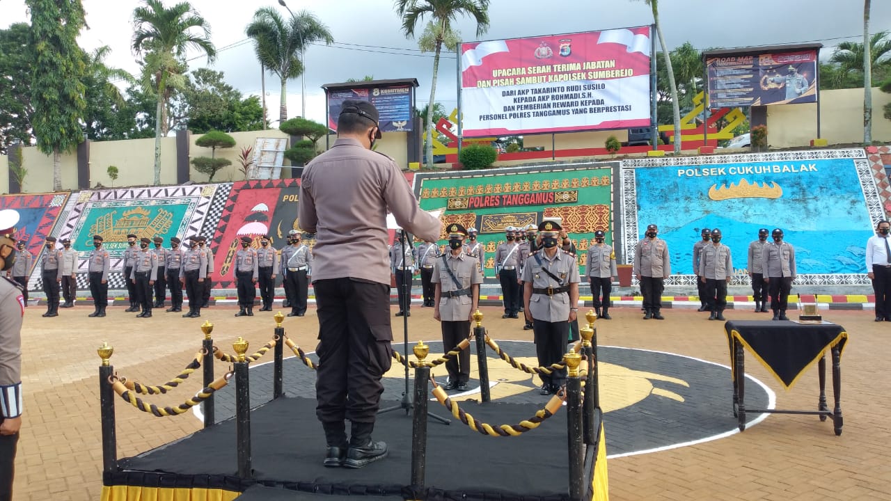 Kapolres AKBP Oni Prasetya dalam amanatnya mengucapkan terima kasih kepada AKP Takarinto atas pelaksanaan tugasnya selama menjadi Kapolsek Sumberejo.
