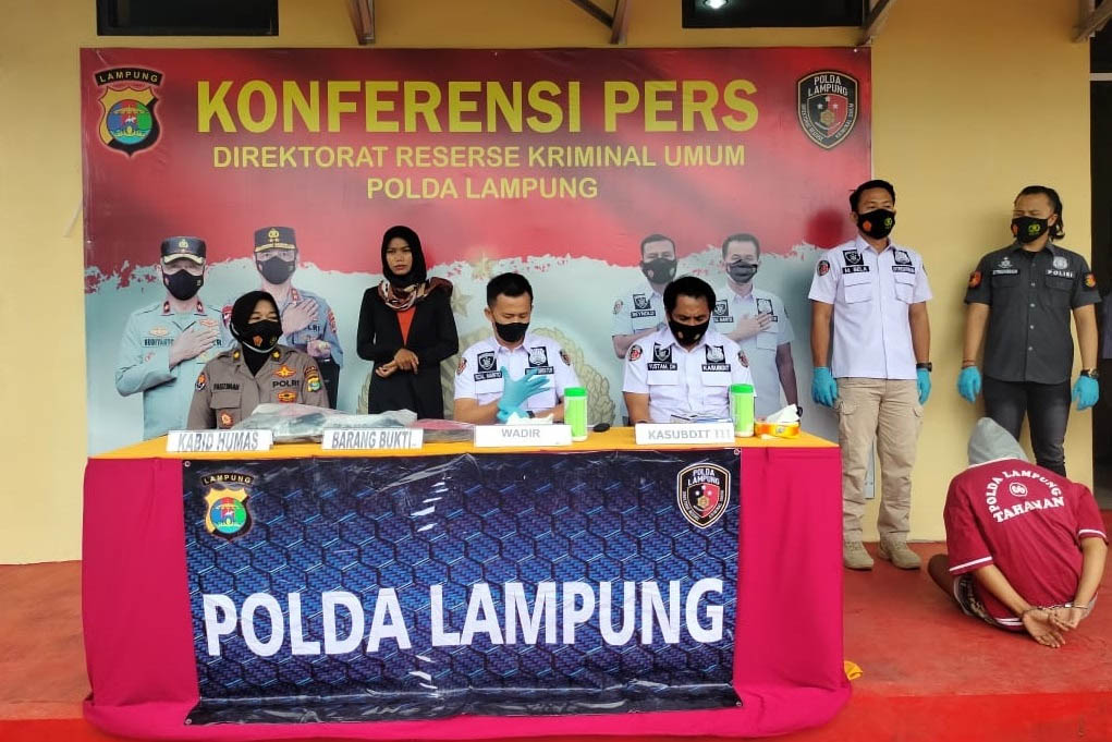 “Tersangka di amankan berdasarkan nomor lamporan Polisi : LP / 620/ VIII / 2021/ LPG / RESTA BALAM / SEK. KDT 30 AGUSTUS 2021,” kata Wadir Krimum, AKBP Rizal Marito SIK SH MSI didampingi Kasubdit 3 AKBP Yustam Dwi Heno dan Penmas Kompol Fauzimah saat Konferensi Pers di Mapolda Lampung Itera.