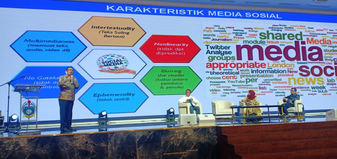 Agus Setiadji juga memberikan penjelasan tentang karakteristik media, perkembangan lingkungan strategis Revolusi Industri 4.0, perang Siber sebagai Perang Generasi kelima, Generasi Pertahanan Siber Dunia, serta bagaimana berprilaku bermedsos.