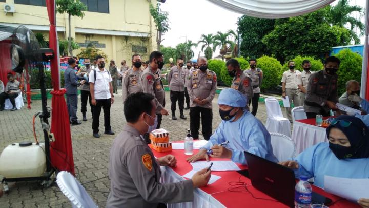 Didampingi Wakapolda Brigjen. Pol Subiyanto dan jajaran PJU Polda Lampung, Kapolda memastikan giat penyuntikan Vaksin Covid-19 di Lingkungan Mapolda berjalan dengan tetap mengikuti protokol kesehatan.
