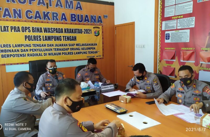 Polres Lampung Tengah dan Jajaran menggelar Operasi Bina Waspada Krakatau 2021 dalam rangka untuk menciptakan situasi kamtibmas melalui peningkatan kesadaran, peran serta dan pemberdayaan masyarakat. Sasaran Oprasi ini selain untuk mencegah terjadinya kejahatan terorisme juga untuk mencegah radikalisme serta anti Pancasila.
