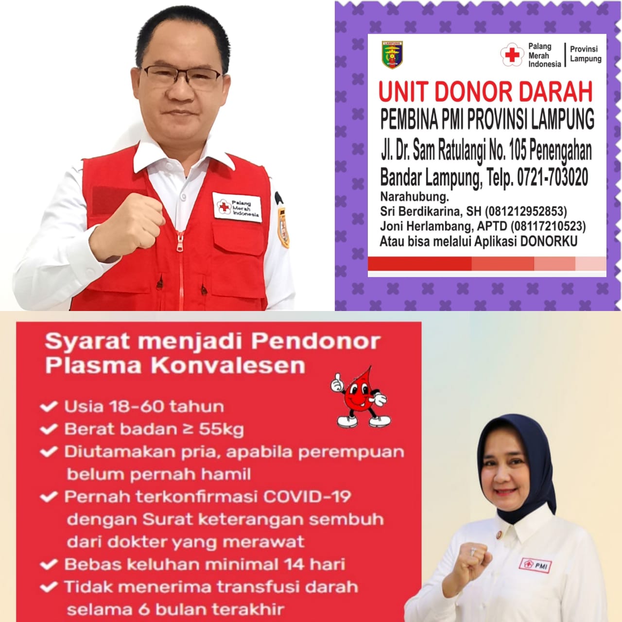 Ayo Donor Darah Plasma Konvelesen yang digaungkan oleh Ketua PMI Provinsi Lampung Riana Sari Arinal ini dapat dilakukan pada Unit Donor Darah Pembina PMI Provinsi Lampung yang beralamatkan : Jl.Dr .Sam ratulangi NO: 105 Penengahan Bandar Lampung dengan Nomor Telfon 0721- 703020.(Kf-Mar)