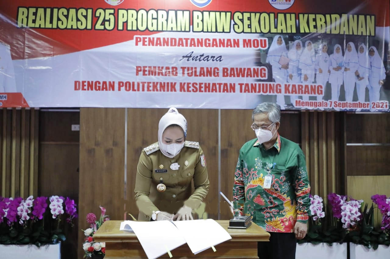 Tulang Bawang, etalaseinfo.com (SMSI) – Realisasi 25 Program BMW Penandatanganan MOU antara Pemerintah Kabupaten Tulang Bawang dengan Politeknik Kesehatan Tanjung Karang Program Sekolah Kebidanan. Selasa (7/09/2021), di Ruang Rapat Utama Kantor Bupati Tulang Bawang.