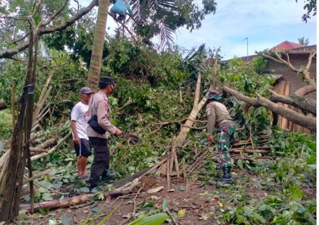 Gotong royong yang dilakukan Babinsa dan Babhinkamtibmas bersama warga itu selain untuk membersihkan pepohonan yang tumbang juga memperbaiki rumah warga yang rusak.