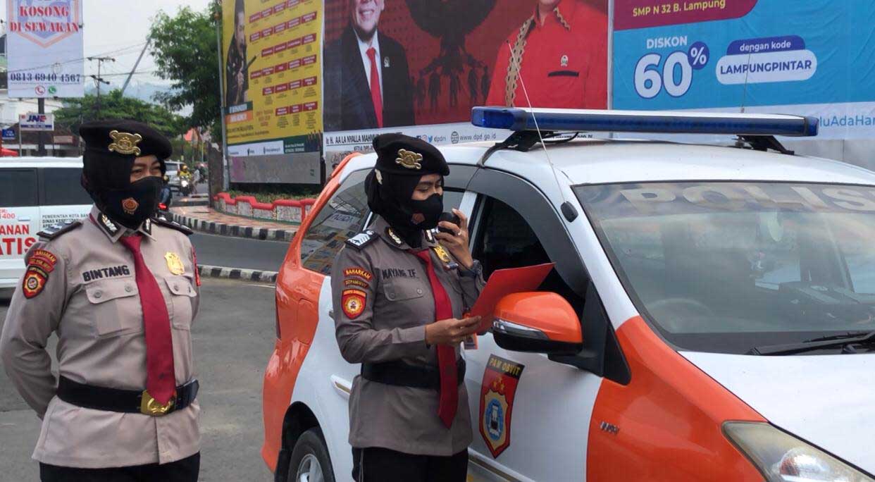 Bandar Lampung, etalaseinfo.com (SMSI) – Polwan Polwan cantik patroli dalam rangka menekan angka kasus Covid-19. Polwan Direktorat Pamobvit Polda Lampung, melaksanakan kegiatan patroli dan memberikan himbauan kepada masyarakat Kota Bandarlampung yang dilaksanakan setiap hari, sejak Jum ‘at (9/7).