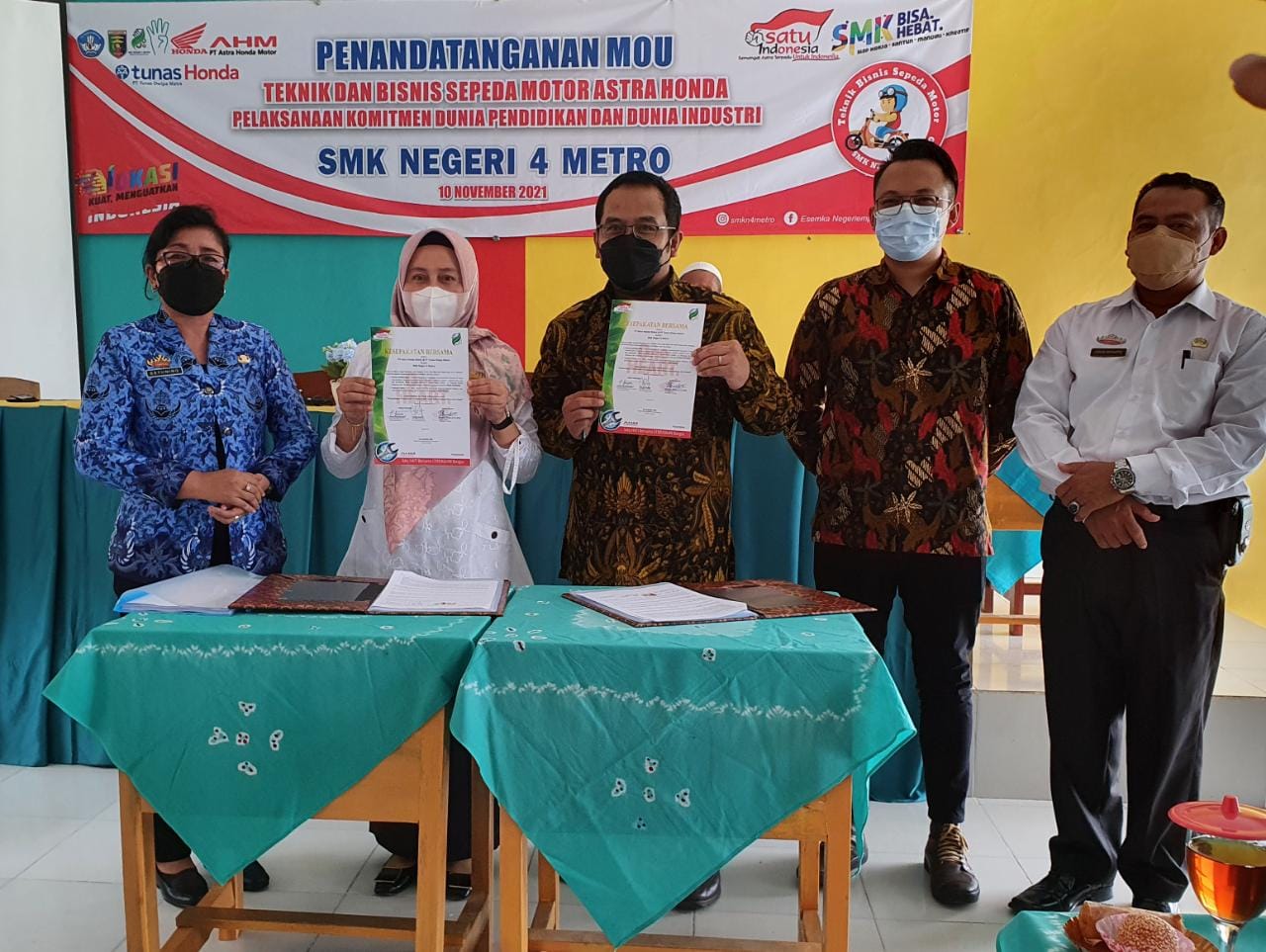 Metro, Etalaseinfo.co.id (SMSI) – Penandatanganan MoU tehnik dan bisnis sepeda motor Astra Honda tentang pelaksanaan komitmen dunia pendidikan dan dunia industri di Aula SMK Negeri 4 Metro Kecamatan Metro Selatan pagi ini Rabu (10/11/2021).