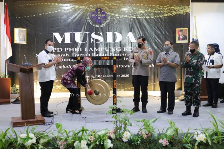 Saibumi.com, Bandar Lampung – Wakil Gubernur Lampung Chusnunia Chalim (Nunik) membuka Musyawarah Daerah ke IX Badan Pimpinan Daerah Perhimpunan Hotel & Restoran Indonesia (BPD-PHRI) Lampung, di Hotel Bukit Randu, Bandarlampung, Kamis, 10 Desember 2020.