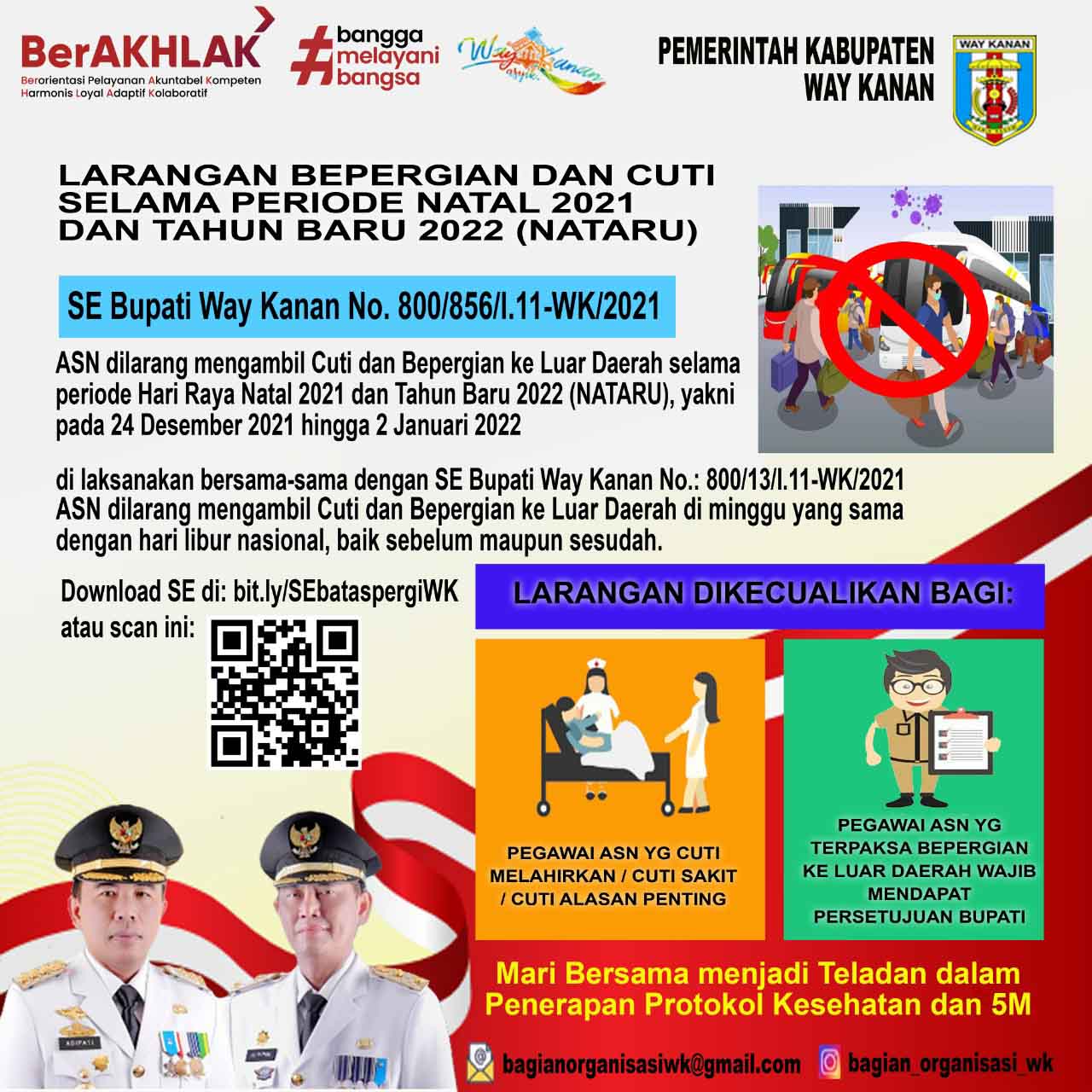 Surat Edaran Bupati Way Kanan Nomor  800/656/I.11-WK/2021 Tentang Pembatasan Kegiatan Bepergian Ke Luar Daerah Dan/Atau Mudik Dan/Atau Cuti Bagi Pegawai Aparatur Sipil Negara Selama Periode Hari Raya Natal Tahun 2021 Dan Tahun Baru 2022 Dalam Masa Pandemi Corona Virus Disease 2019  dilingkungan Pemerintah Kabupaten Way Kanan tersebut merupakan tindak lanjut dari Surat Edaran Menteri PANRB Nomor: 26 Tahun 2021 dan Surat Edaran Gubernur Lampung Nomor: 045.2/4300/07/2021 tentang Pembatasan Kegiatan Bepergian Ke Luar Daerah Dan/Atau Cuti Bagi Pegawai Aparatur Sipil Negara Selama Periode Hari Raya Natal Tahun 2021 Dan Tahun Baru 2022 Dalam Masa Pandemi Corona Virus Disease 2019