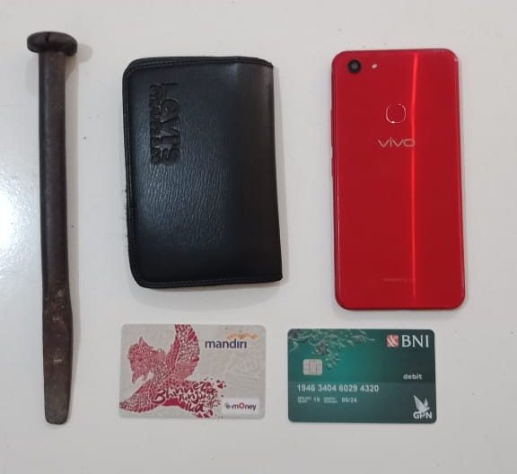 Dari penangkapan terbut, polisi menyita 1 Buah Hp Vivo warna merah, 1 buah besi pahat yang digunakan pelaku melakukan pencurian. Lalu 1 buah dompet merk Levis warna hitam dan 1 buah ATM BNI serta 1 Buah kartu tol. (Hms)