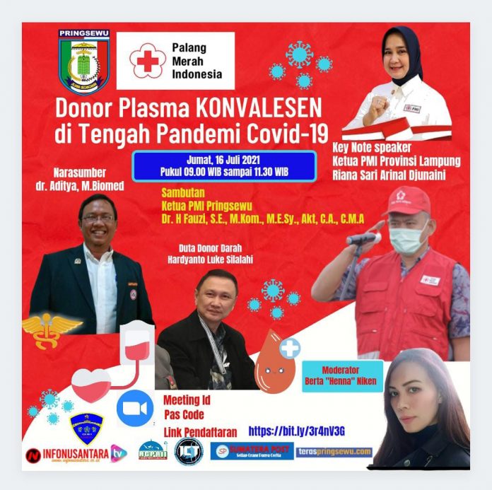 Terkait donor darah plasma konvalesen tersebut, DR.Fauzi, SE, M.Kom., ME.Sy., Akt., CA, CMA, yang juga Ketua Palang Merah Indonesia (PMI) Kabupaten Pringsewu mengatakan pihaknya akan mengadakan webinar bertema ‘Donor Plasma Konvalesen di Tengah Pandemi Covid-19′.