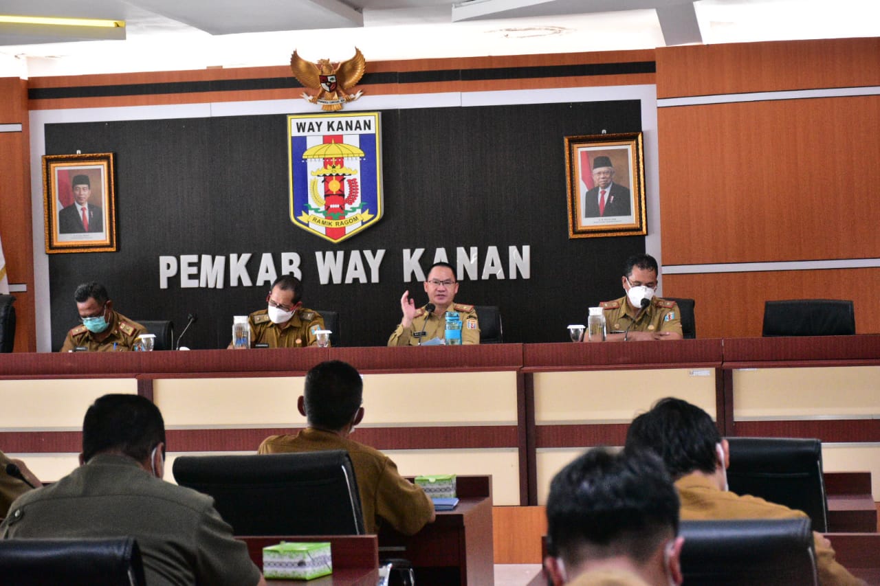 Way Kanan, etalaseinfo (SMSI) –  Sekretaris Daerah Kabupaten, Saipul, S.Sos.,M.IP bersama Staf Ahli Bidang Pemerintahan, Hukum dan Politik, Imanto, S.H.,M.M, Asisten I Bidang Pemerintahan dan Kesra, Selan, S.Sos.,M.M, Asisten II Bidang Perekonomian dan Pembangunan, Ir. Kussarwono, M.T, memimpin Rapat Koordinasi Pembahasan Kampung Tangguh Anti Narkoba Berbasis Ekonomi di Kabupaten Way Kanan, Senin (11/10/2021) di Ruang Rapat Utama Pemkab Way Kanan.