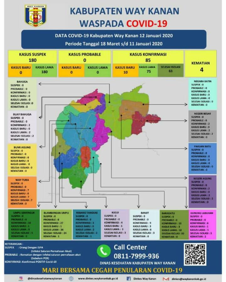Way Kanan, etalaseinfo.com – Kepala Dinas Kesehatan, Anang Risgiyanto, S.KM., M.Kes yang juga juru bicara gugus tugas percepatan penanganan Covid-19 kabupaten way kanan menyampaikan informasi adanya penambahan pasien Covid-19 asal kabupaten way kanan pada hari selasa 12 januari 2021.