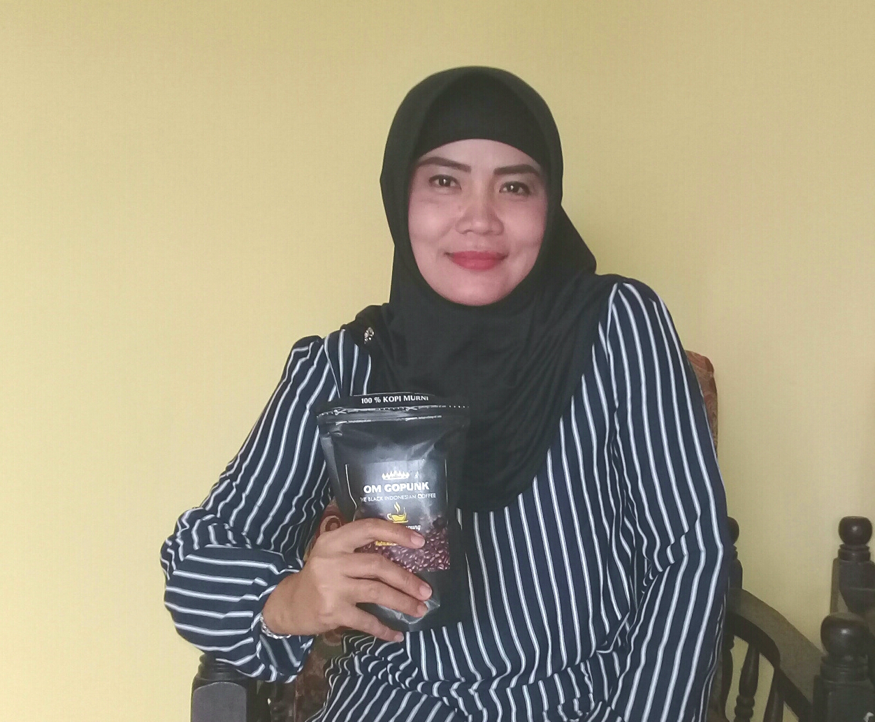 Adanya kopi bermerek ‘Om Gopunk’ yang didistribusikan Hi. Abdul Ghofur, warga Desa Sawojajar, Kecamatan Kotabumi Utara, Mardiana memberikan apresiasi tersendiri.