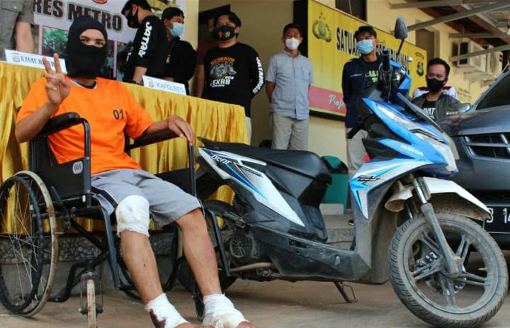 Residivis sekaligus DPO Curat Polres Metro ini tak sanggup lagi berkata – kata setelah tiga peluru bersarang di kakinya. Pria 26 tahun itu kini hanya mampu menyampaikan permohonan maafnya kepada masyarakat Kota Metro dengan ekspresi dua jari (Victori).