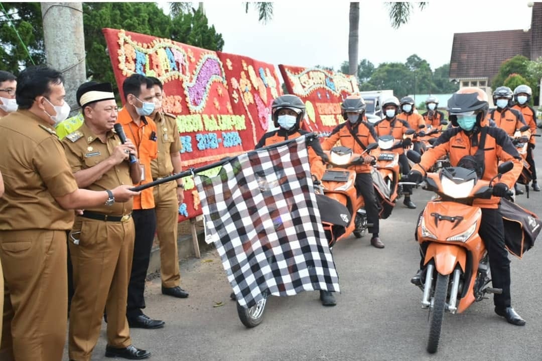 Bupati Lampung Timur Dawam Rahardjo di dampingi Wakilnya Azwar Hadi, Para jajaran OPD, Kadisdukcapil, Camat dan PT Pos Indonesia MOU sekaligus Launching kerjasama pelayanan publik antara Pos dan Capil tersebut, di Pelataran rumah Dinas Bupati, Sukadana, Senin sore (12/4/2021).