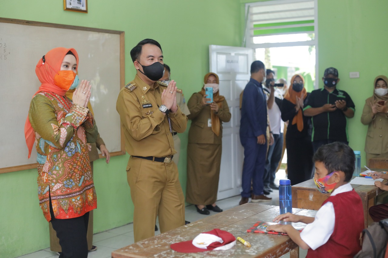 Kedatangan Bupati Adipati, Ketua TP PKK Kabupaten, Dessy Adipati dan jajaran disambut langsung oleh Kepala Sekolah dan Dewan Guru SMP N 01 Blambangan Umpu yang langsung meninjau kesiapan Sekolah dalam melaksanakan SOP PTM Terbatas terutama menerapkan Protokol Kesehatan.