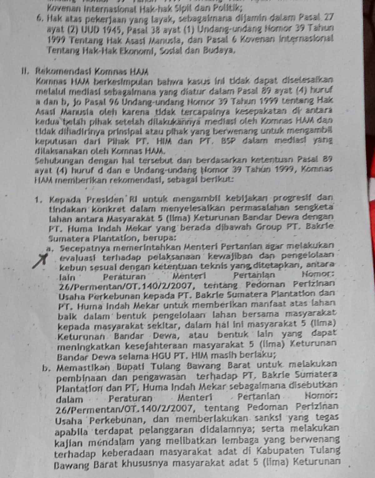 “PT HIM wajib mempertanggungjawabkan pengelolaan lahan 5 (Lima) Keturunan Bandar Dewa yang telah secara sewenang-wenang tanpa melalui proses ganti rugi kepada yang berhak yaitu Ahli Waris 5 Keturunan berdasarkan Alas Hak Soerat Keterangan Hak Kekoeasaan Adat Kampoeng Bandar Dewa Nomor 79/ Kampoeng/1992 yang terdaftar di Kantor Pesirah Marga Tegamoan pada tanggal 27 April 1936 dan telah ditetapkan oleh Pengadilan Agama Kota Metro Lampung,” tegas Sobrie.