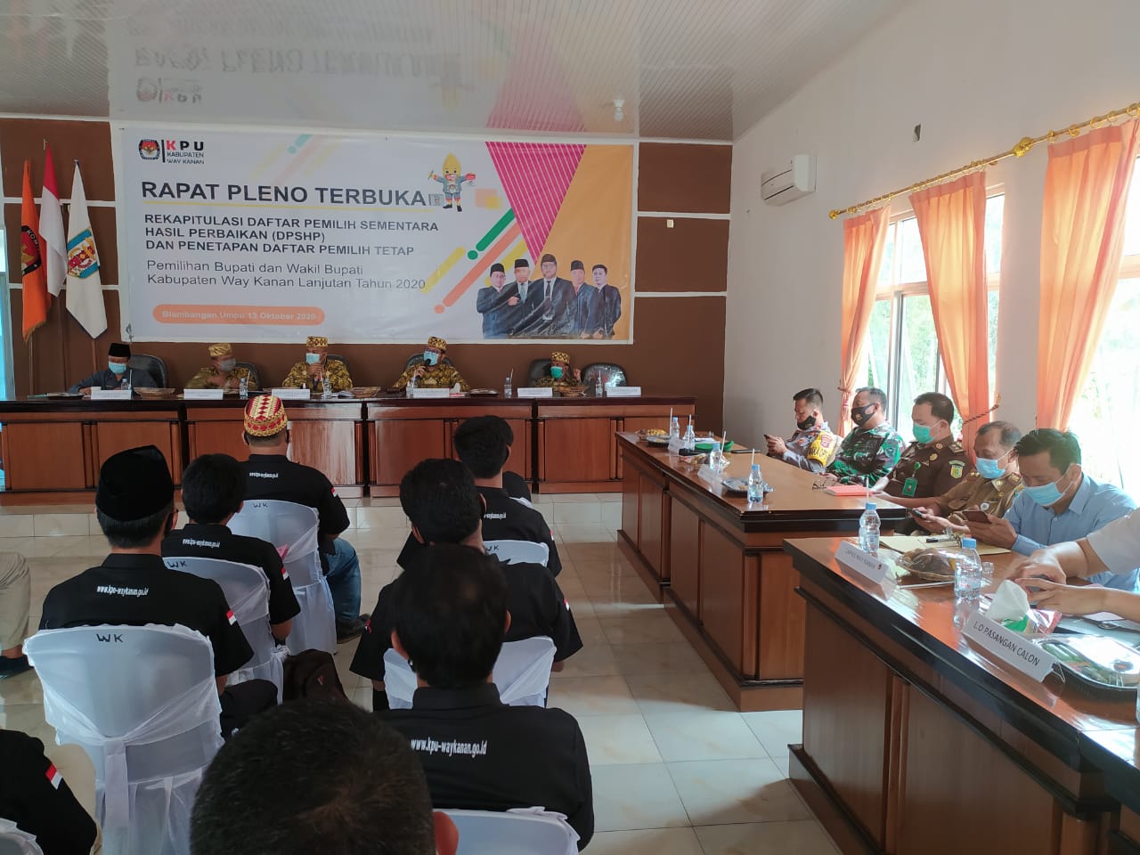 Ketua KPU Way Kanan Refki Dharmawan, didampingi Kordiv Data Informasi I Gede Klipz Darmaja mengatakan bahwa hari ini KPU Way Kanan melaksanakan rapat pleno Rekapitulasi DPSHP sekaligus menetapkan sebagai DPT Pilkada 2020. Sebelumnya pleno DPSHP telah dilaksanakan di 227 PPS pada tanggal 5 Oktober, dan tingkat PPK dilaksanakan tanggal 8-9 Oktober.