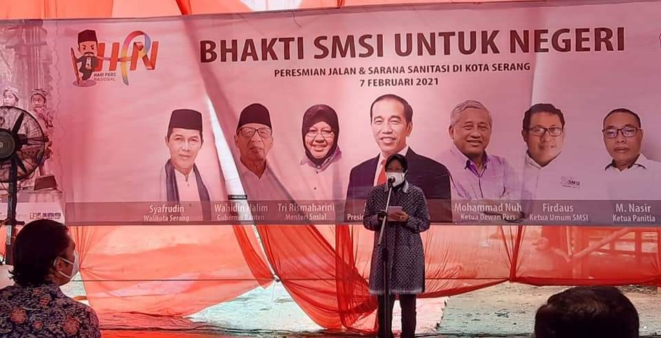 Pujian bunda Risma dialamatkan pada SMSI dalam acara peresmian Jalan Bakti SMSI dan sanitasi berupa 16 tempat mandi, cuci, dan kakus (MCK), sebagai hadiah untuk masyarakat setempat, yakni Kampung Jaha, Kelurahan Pagar Agung, Kecamatan Walantaka, Kota Serang, Provinsi Banten.