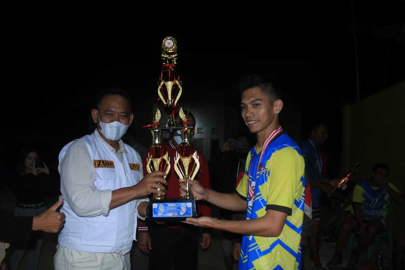 Penyerahan medali dan piala untuk para juara, dilakukan oleh Wakil Bupati Pringsewu Fauzi didampingi KadisporaPar Jahron dan Ketua KONI Pringsewu Dwi Pribadi selepas pertandingan final di Lapangan Bola Voli Tunas Mandiri Sukoharjo III, Kecamatan Sukoharjo, Ahad (12/12/21) malam.