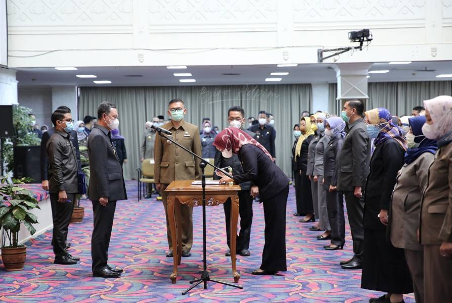 Sekretaris Daerah Provinsi Lampung Fahrizal Darminto, saat mewakili Gubernur, melantik 90 Pejabat Administrator atau Eselon III di Lingkungan Pemerintah Provinsi Lampung, di Lantai 3, Balai Keratun, Jumat petang (15/1/2020).