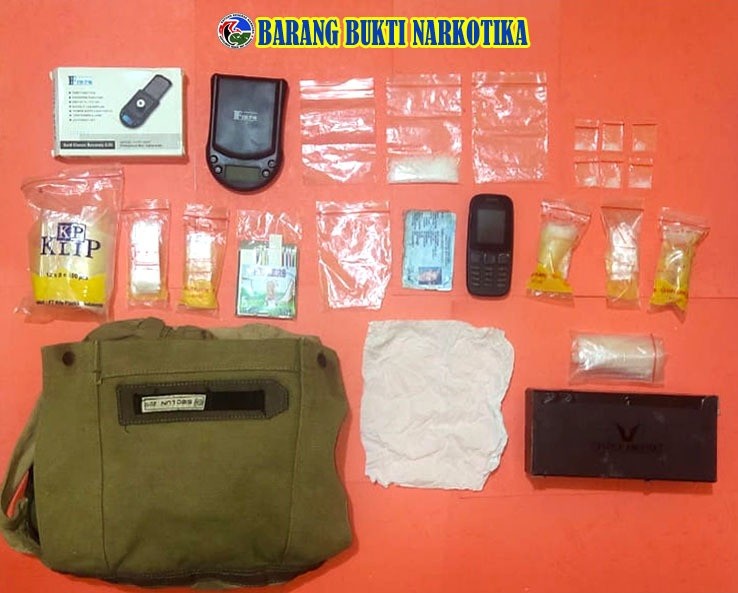 Dalam penindakan petugas mengamankan juga 1 (satu) unit timbangan digital, 1 (satu) unit HP (Handphone) merk Nokia 105, 1 (satu buah kotak merk gentle monster warna hitam, 1 (satu) buah tas selempang, 3 (tiga) lembar plastik klip bening ukuran besar dan 1 (satu) bungkus plastik merk kp klip ukuran besar berisikan 24 (dua puluh empat) lembar plastik klip bening ukuran besar